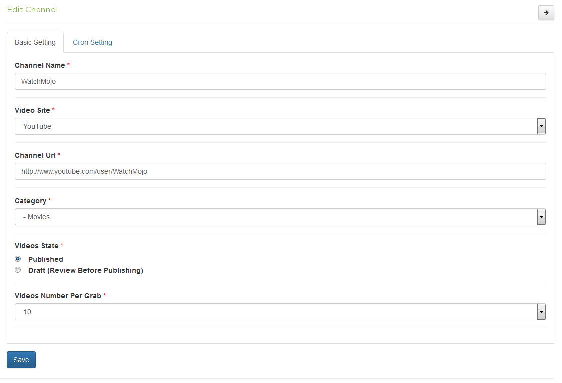 | Auto Update Channel | if you are using cronjob check this option to import videos from this channel automatically when cronjob run. |