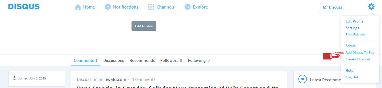 Ater completing the signup you will be redirected to your profile page and click on Add Disqus to Site
