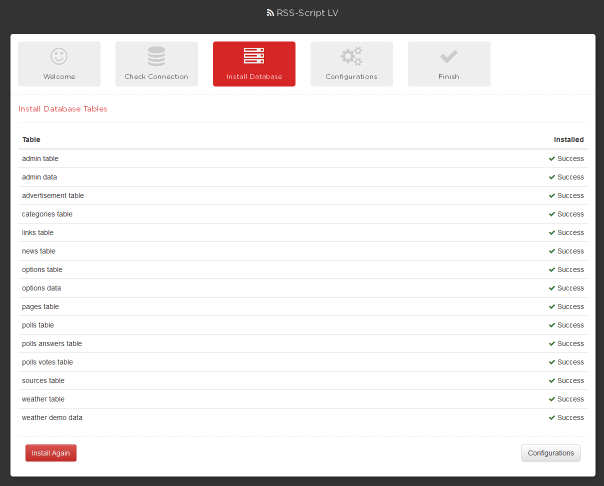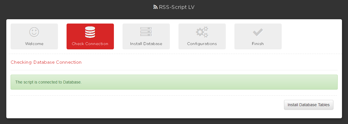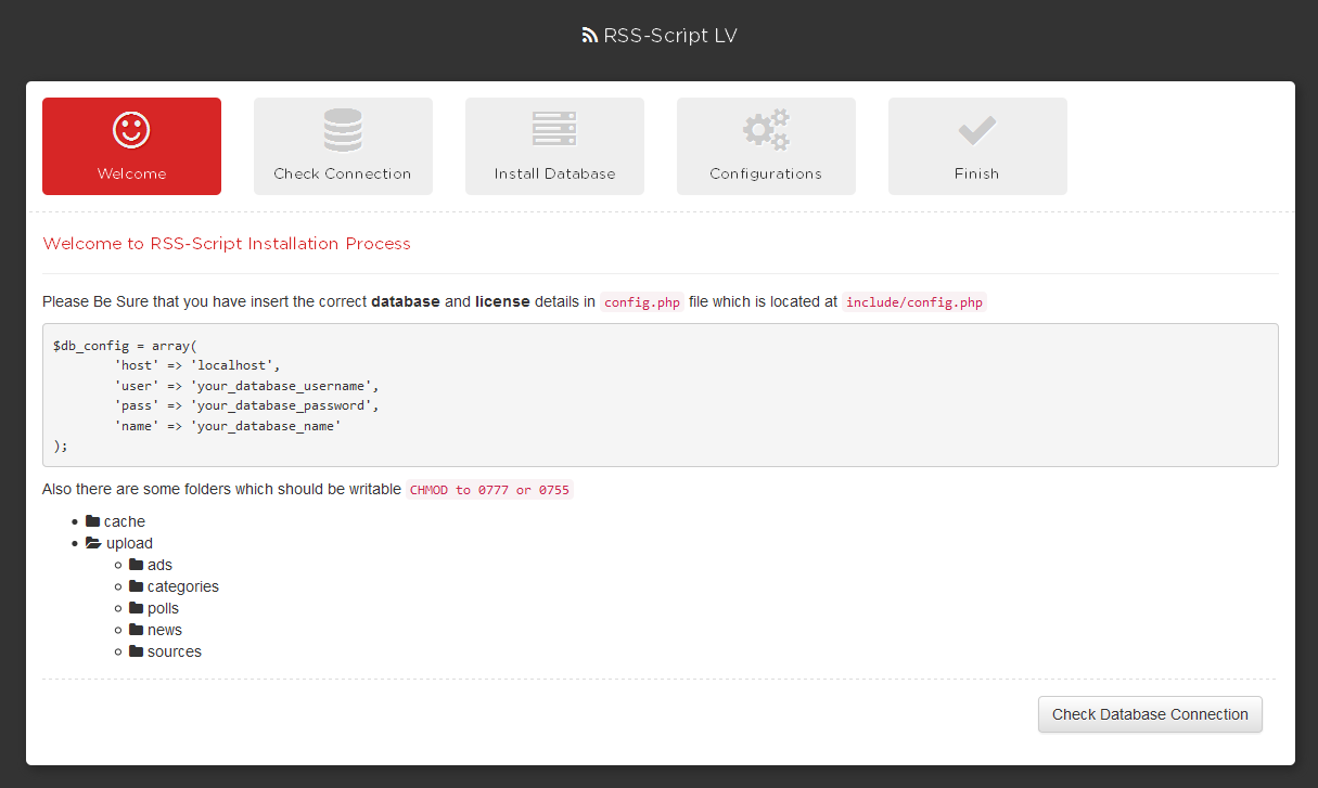 Second step is checking the database connection. if the script warning you that there is no connection to database then you should edit the config.php file and Insert correct details then click on Check Again if everything is OK you will continue to the next step.