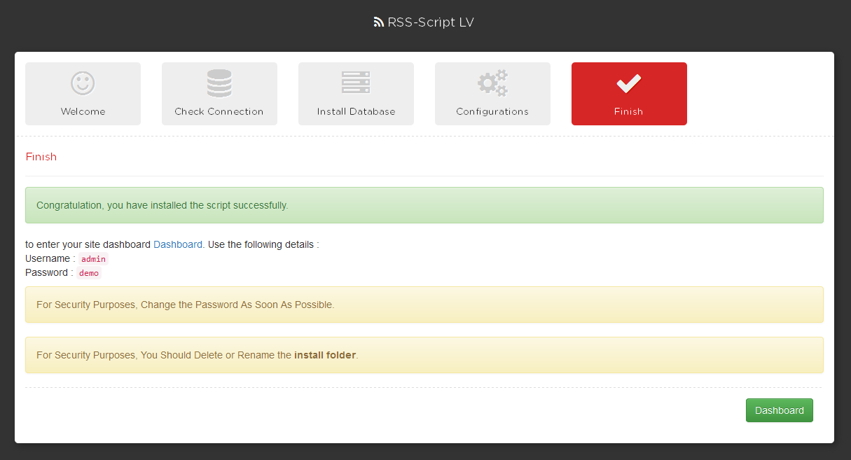 Last Step : this screen has some instructions with dashboard link to login as admin and admin login details to manage the script.